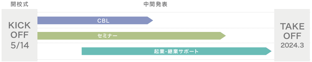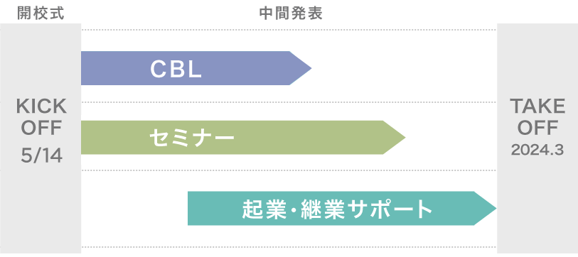 | 提供科目等 | CBL4科目(→1科目選択)、セミナー6科目(→最大6科目選択可能)、起業・継業サポート(→自由選択) |