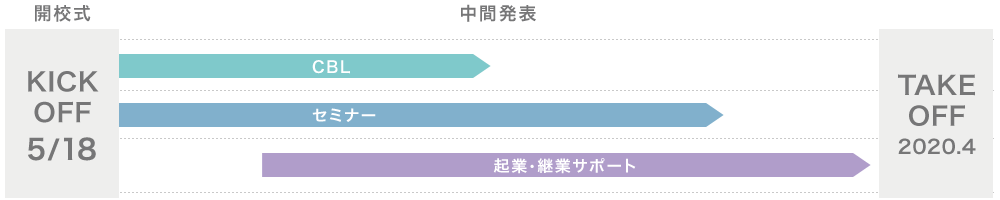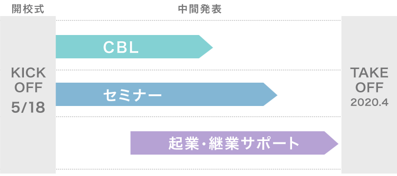 2019年度スクールは,2019年5月から2020年4月までの1年間のプログラムです。CBL (Community Based Learning) は5月〜9月の間で1科目選択。セミナーは年間を通して順次開講されます。また後半にかけてはビジネスプランを具体化していき、1年後の事業スタートを目指します。